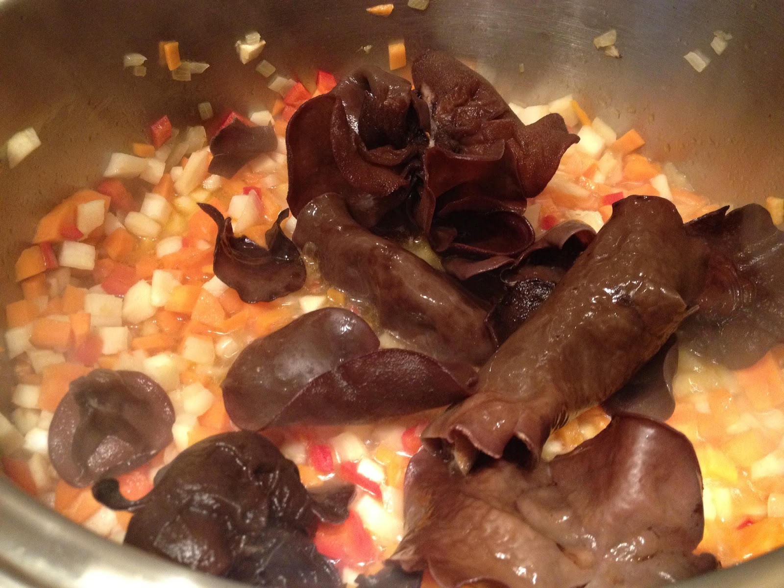 Szárított fafülgombát előzőleg vízbe áztattuk.